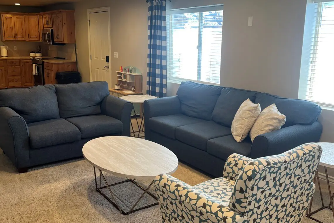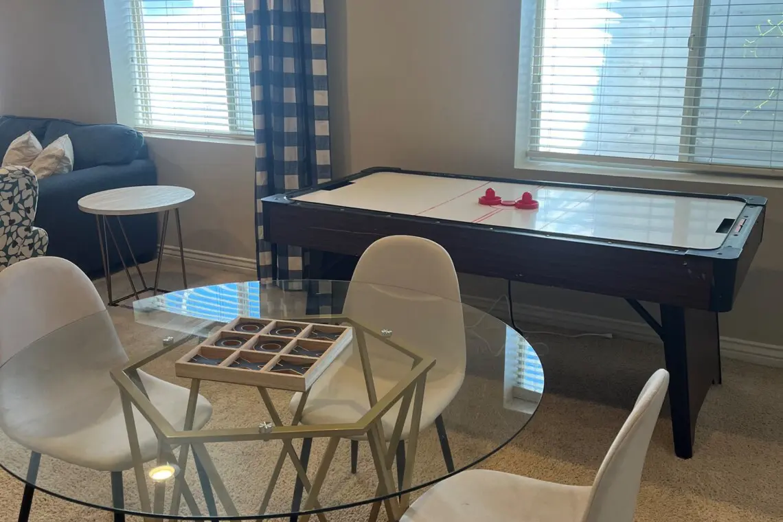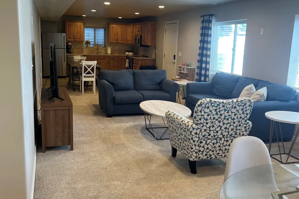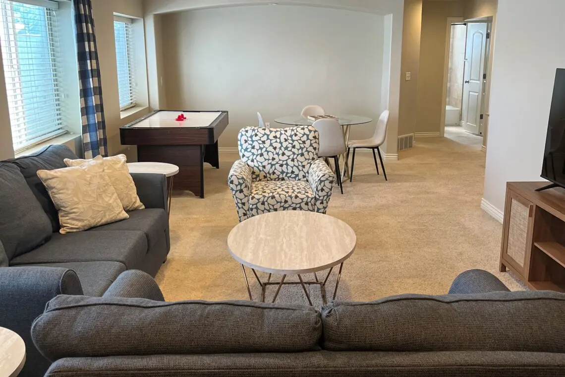 Stunning basement apartment. The open space has everything you will need including an Air Hockey Table! Beautiful full kitchen, 2 bedrooms and 1 bathroom, laundry and a huge, beautiful family room. Whether you are gathering as a family, visiting the area or escaping for time away – this is the space for you! 25 min to Sundance – Ski, hike, and explore the mountains. Pickleball and Tennis in the backyard as well as a beautiful park with a play area and covered picnic area.